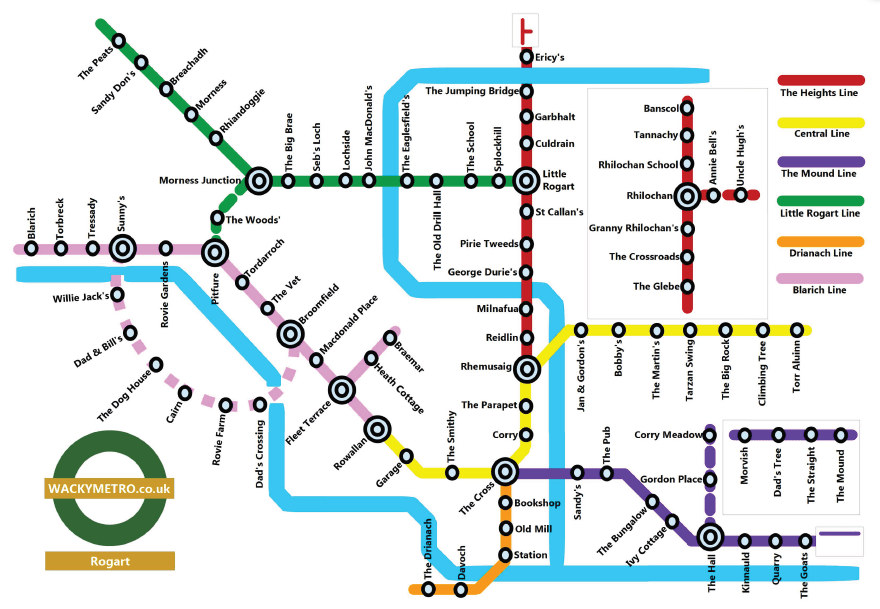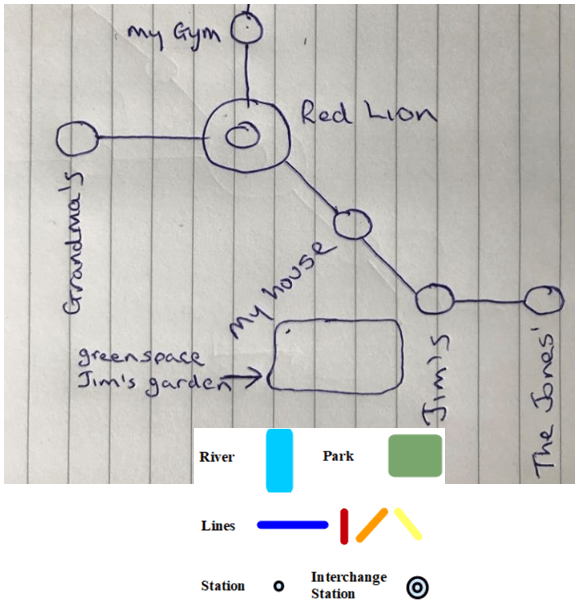 Step 2 – rough sketch your drawing, take a photo of it on your smartphone or add it to a word document and send it to wackymetro@outlook.com. Have a think about the the icons you might want to incorporate (stations, parks, rivers etc), and the colour and name of the lines. We worked recently with a customer on a small village in the Scottish Highlands who sent this initial sketch as an example;